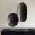 A pair of Brutalist sculptures reflect the free-form shape of a flower. Hammered forms of natural iron are accented with an antique brass tack welded at the very center for contrast. Secured on a square base, they can be displayed together or separately. Finish will vary.