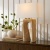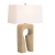 A sculptural form of sand faux travertine makes an artful base. This style's organic keyhole cutout plays with positive and negative space to lend an edge to any tabletop. Finished with bronze steel hardware, a rectangular ivory microfiber drum shade lined in off-white cotton and a matching faux travertine finial. Finish will vary.