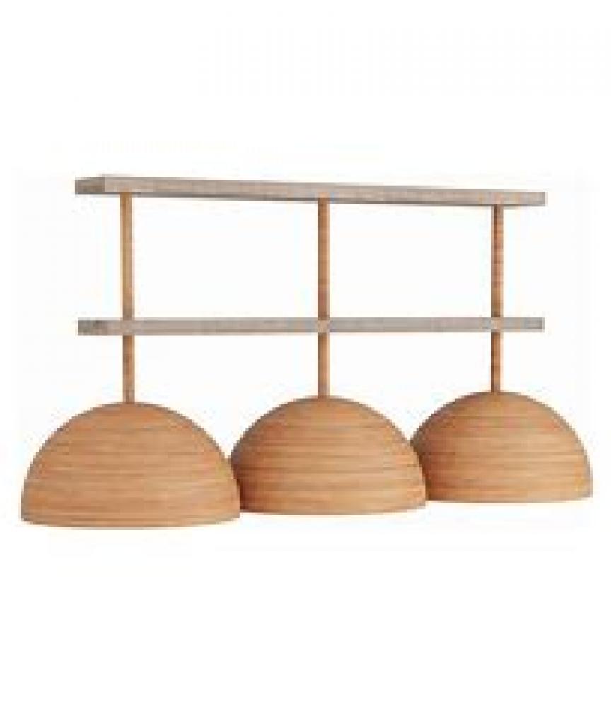 OUR BILLIARDS-STYLE VEGA CHANDELIER IMPARTS A MODERN, COASTAL SENSIBILITY. THE LINEAR FIXTURE IS HAND-CRAFTED IN A TRIO OF BOWL-SHAPED SHADES THAT ARE TIGHTLY WRAPPED IN HONEY RATTAN, CONTRASTING THE WHITE GESSO INTERIOR. RATTAN FEATURES AGAIN, WRAPPING THE PIPE SUSPENSION THAT PIERCE TWO WALNUT-STAINED WOOD PLANKS. FINISH WILL VARY.