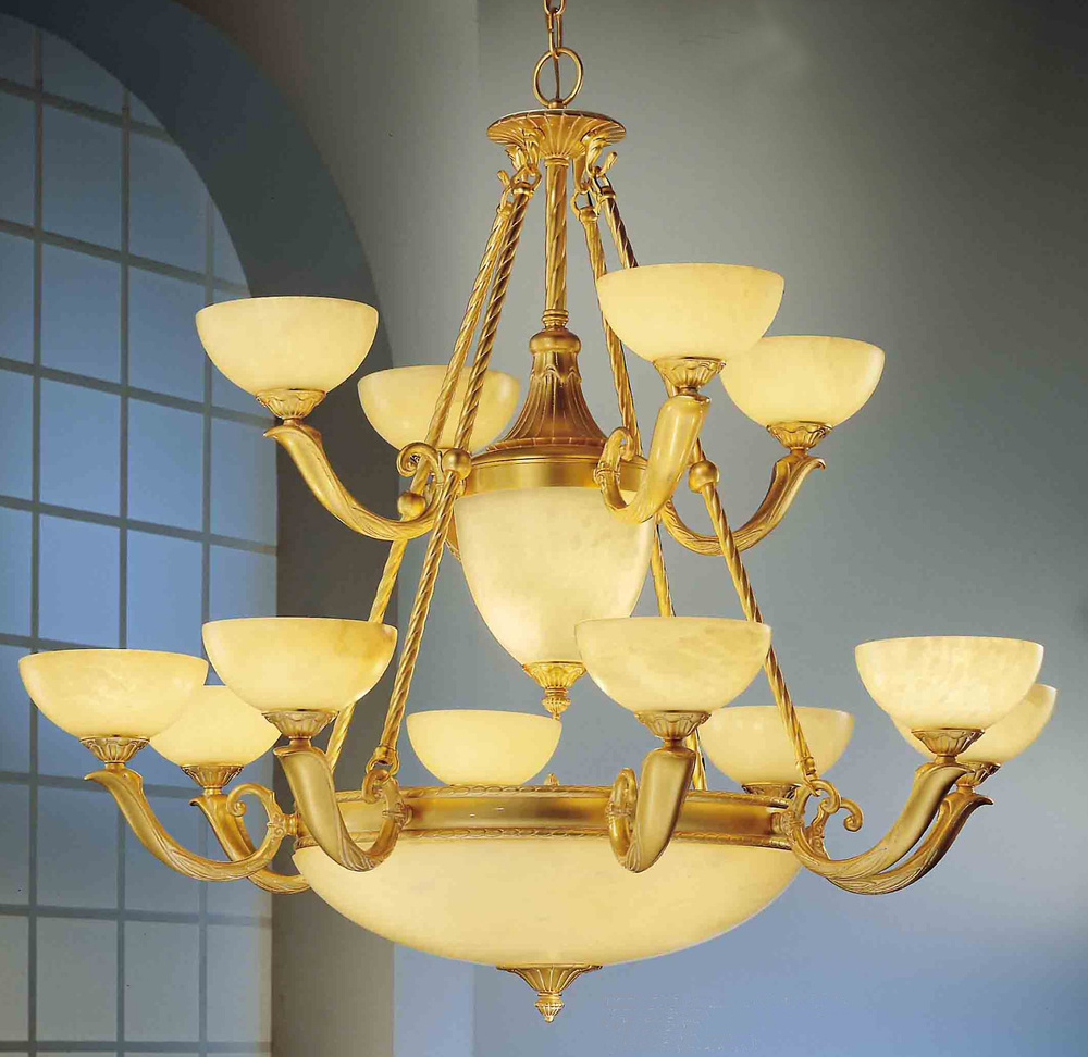 42"Wide x 42"Long x 38"High Finish Shown: Gold Matte Crystal Shown: n/a The Valencia Series are solid brass cast fixtures made in Europe. For that subtle, elegant look that is subdued but not suppressed, these empire urn-shaped chandeliers either in single or two tire configurations offer stature to any entryway or dinning room. Finished in a muted 24k gold Matte (GM) or traditional Antique Bronze (AB). Fixtures in this series that have a 5 in the 3rd digit (e.g. 5652) have frosted glass shades with a hand cut pattern, those with a 6 in the 3rd digit (e.g. 5662) have genuine alabaster stone shade, that have a 7 in the 3rd digit (e.g. 562) have cream coloers glass shades painted to simulate alabaster.