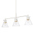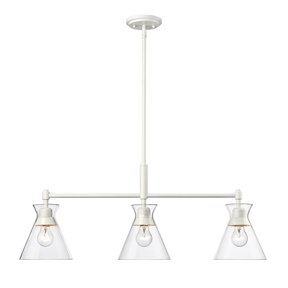 Bring modern minimalism into your home with the Golden Lighting Malta 3-light Island Light in Matte White. Featuring a glass shade and a matte white frame, it creates a welcoming atmosphere. The clear glass shade provides brilliant, unobstructed light, showcasing the beauty of the bulb and fixture design. Its timeless appeal fits seamlessly into various styles, including Scandinavian and industrial-chic. The matte white finish enhances clean lines, creating an understated and sophisticated look. Tailored for kitchen islands, this piece is Dry Location Rated, suitable for indoor environments such as bedrooms and living rooms. It’s sloped-ceiling compatible and has an adjustable height feature for easy installation. Overall dimensions measure 34"W x 13"H x 7.13"D, and it requires 3 E26 Medium base bulbs (not included), with a maximum of 60 watts per bulb. Enhance your home with this sleek and stylish fixture, perfect for contemporary living.
