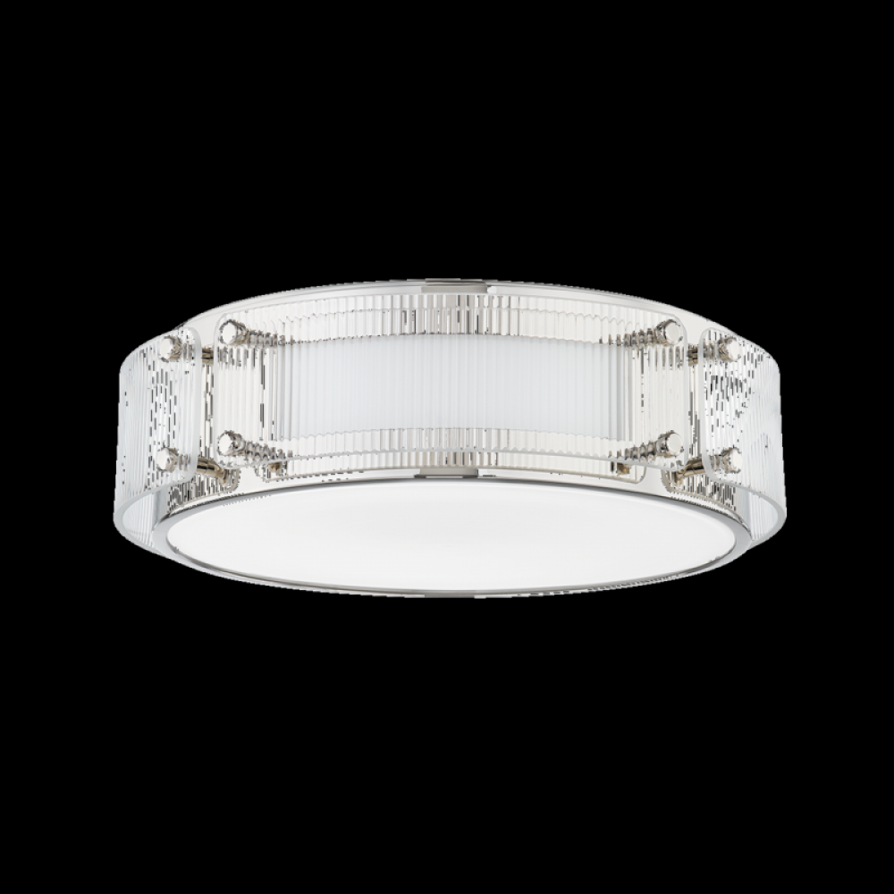 Rectangular panels are cut from Aged Brass or Polished Nickel metalwork and topped by a curved ribbed glass, making this traditional flush mount design feel updated and fresh. Light not only flows through the opal glossy glass lens at the bottom but seeps through the pockets on the sides and plays off the ribbed panels. Exposed hardware details complete the clean, modern aesthetic.