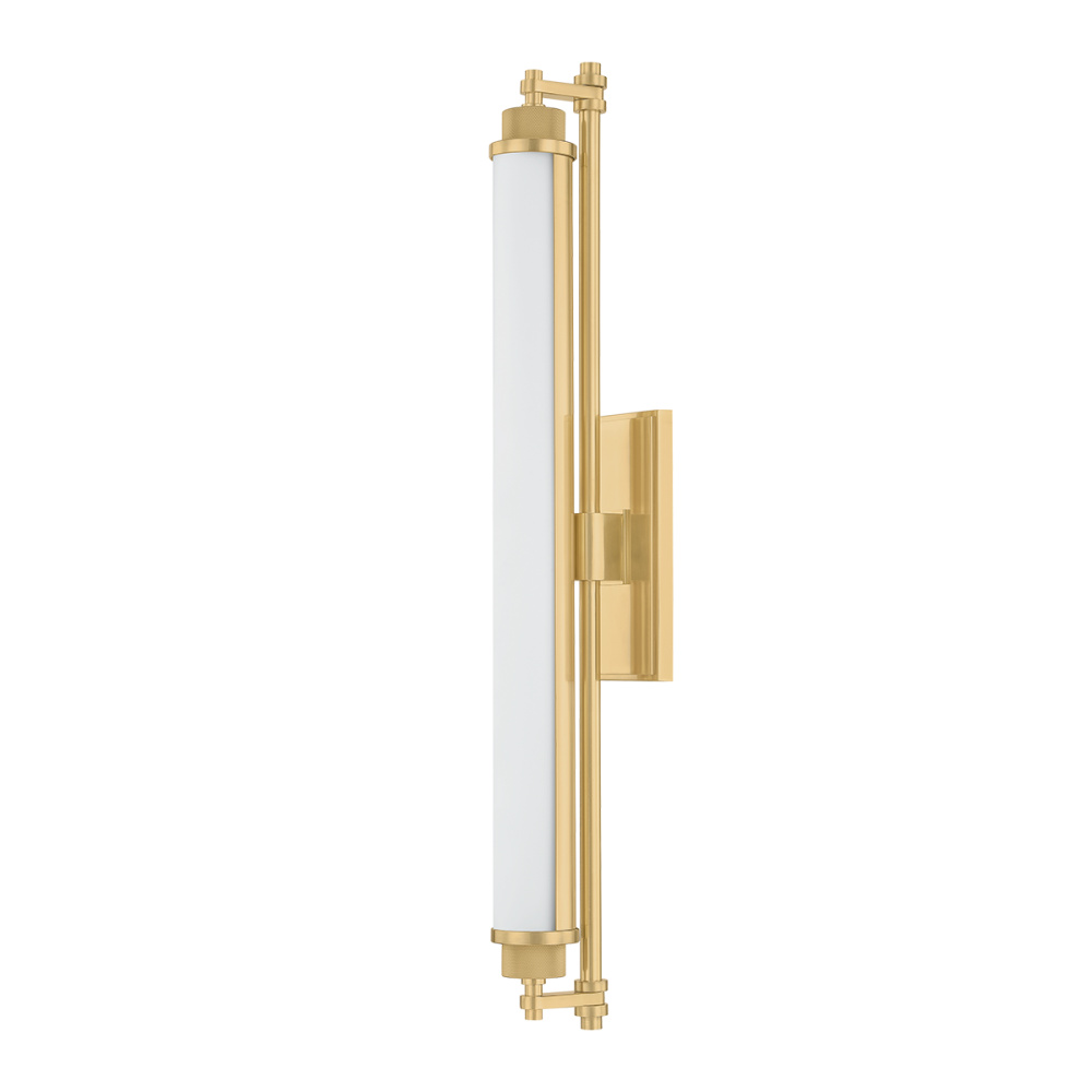 Designed for bath and powder rooms, Plandome is a sleek, machine-inspired sconce with high functionality. Featuring a single LED-lit opal matte glass tube supported by a central stem, this slender fixture can be used individually or in multiples as needed. Finished in Aged Brass or Polished Nickel, the metalwork adds a stylish quality to a thoroughly modern sconce. Available in two sizes.