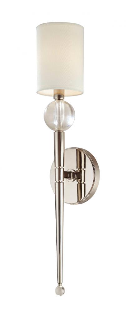 Topped by a soft-white fabric shade, the tapered wand of the Rockland sconce showcases the glamour of shining crystal orbs. While the Polished Nickel finish projects a mirror-like shine, its warm tone complements the shade’s soft hue.