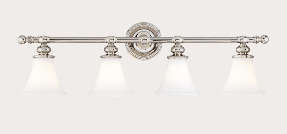 Bells of mouth-blown opal glass resound with timeless style in our Weston bath family. Cast oblong-shaped socket bases suggest a variety of styles into which the fixture could fit. Capping the ends of the bath bar with ball finials complements the circular shape of the backplate.