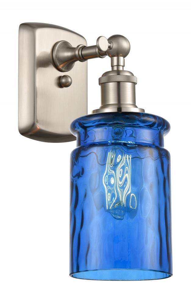 right arrow Long Description: Candor - 1 Light 5" Sconce - Incandescent Bulb - Brushed Satin Nickel Finish - Princess Blue Waterglass Shade