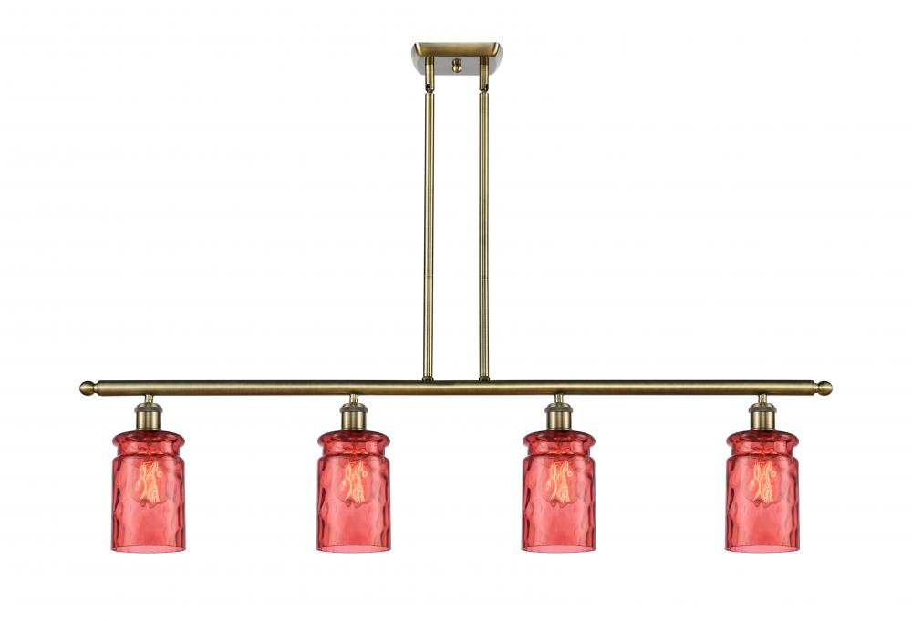 right arrow Long Description: Candor - 4 Light 48" - Stem Hung Island Light - Incandescent Bulb - Antique Brass Finish - Jester Red Waterglass Shade