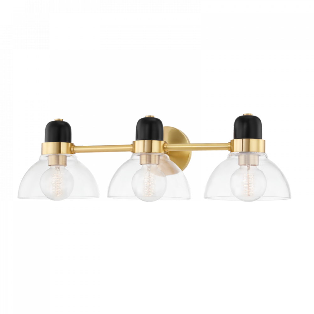A modern industrial muse, Camile draws inspiration from the classic bistro light. Contemporary accents like the open, exaggerated shade allow light to flow freely, giving the piece a natural mystique. A soft black finish is accompanied by aged brass or polished nickel, providing a two-tone effect that is offset by hand-blown glass.