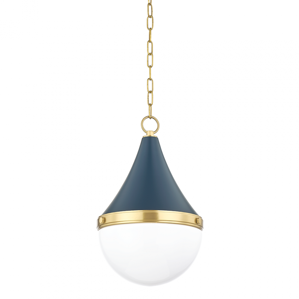 With a slight nod to the nautical, Ciara reimagines a classic design in a way that feels current and modern. A conical metal shade holds an opal glossy glass diffuser creating an overall teardrop silhouette. The beveled Aged Brass band at the center separates the shade and the diffuser while the exposed hardware adds a subtle industrial edge. The shade is available in a clean Soft Cream finish or a refined Soft Navy.