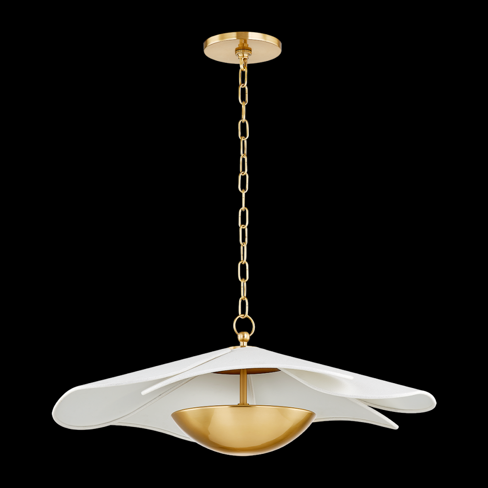 Flowing, petal-shaped, off-white linen shades and Aged Brass accents add a subtle natural style overhead that feels chic. The flush mount lights the shade from within, while light fills the metal bowl and shines upward to illuminate the pendant's linen shades from underneath. Part of our Home Ec. x Mitzi Tastemakers collection.