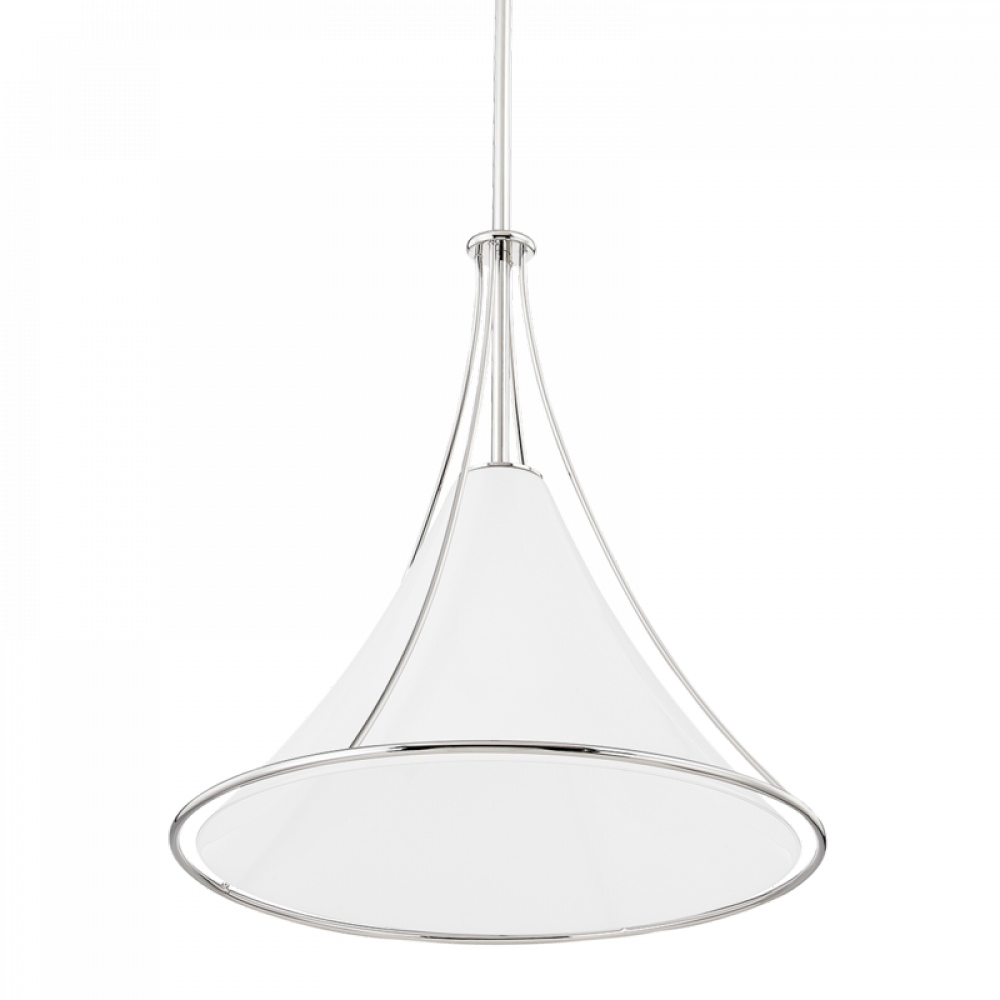 Delicate, elegant, feminine and fun… Madelyn has it all. Inspired by vintage Parisian pendants, an opal shiny glass shade is gently wrapped by curved metal in aged brass or polished nickel. Simple and versatile, this pretty pendant would work well in a variety of interiors.