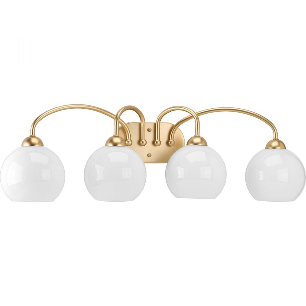 Inspired by the revival of mid-century fashions, the Carisa collection brings home this classic style. A metallic finish supports glossy white glass globes to create a timeless modern design. Four-Light Bath in a Vintage Gold finish.