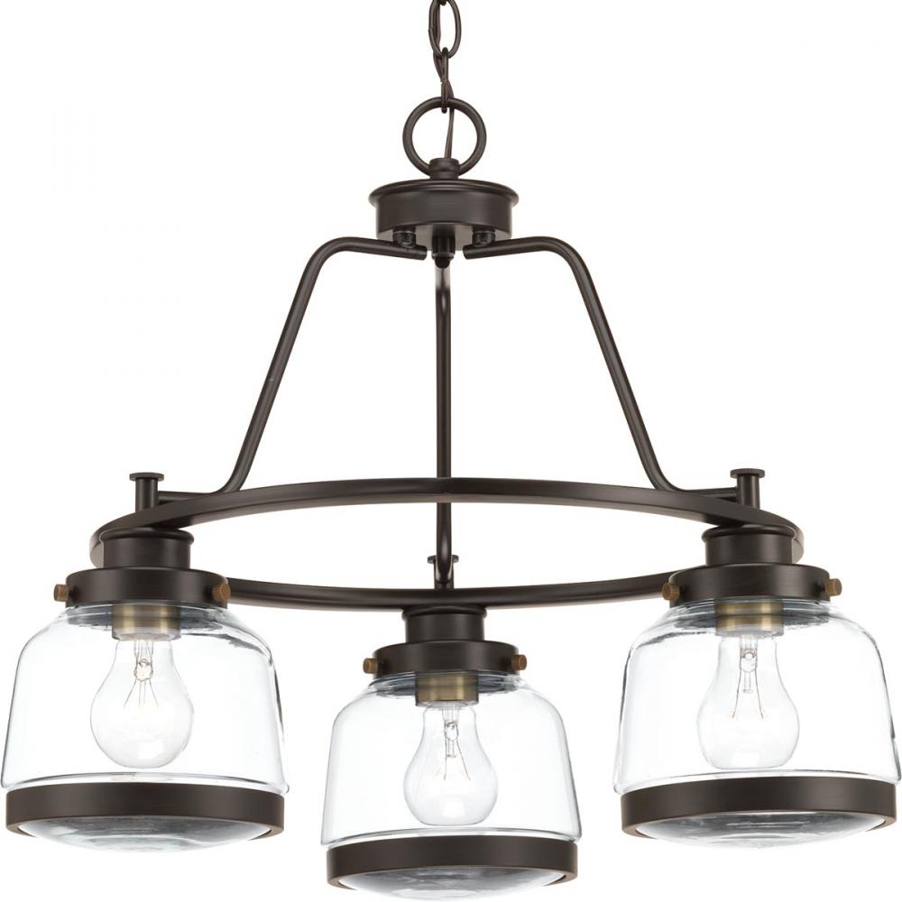 The Judson collection features a timeless clear schoolhouse-style globe. Metal fittings add distinction to complete the vintage look. Judson provides the perfect compliment to farmhouse or coastal-inspired homes. Three-light chandelier in an Antique Bronze finish.