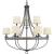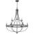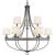 The nine-light chandelier in the Gulliver Collection features arching and delicate details that curve to create an airy design. Dual toned frame color combinations in a Graphite finish with weathered oak accents The hand painted wood grained texture complements Rustic and Modern Farmhouse home decor, as well as Urban Industrial and Coastal interior settings.