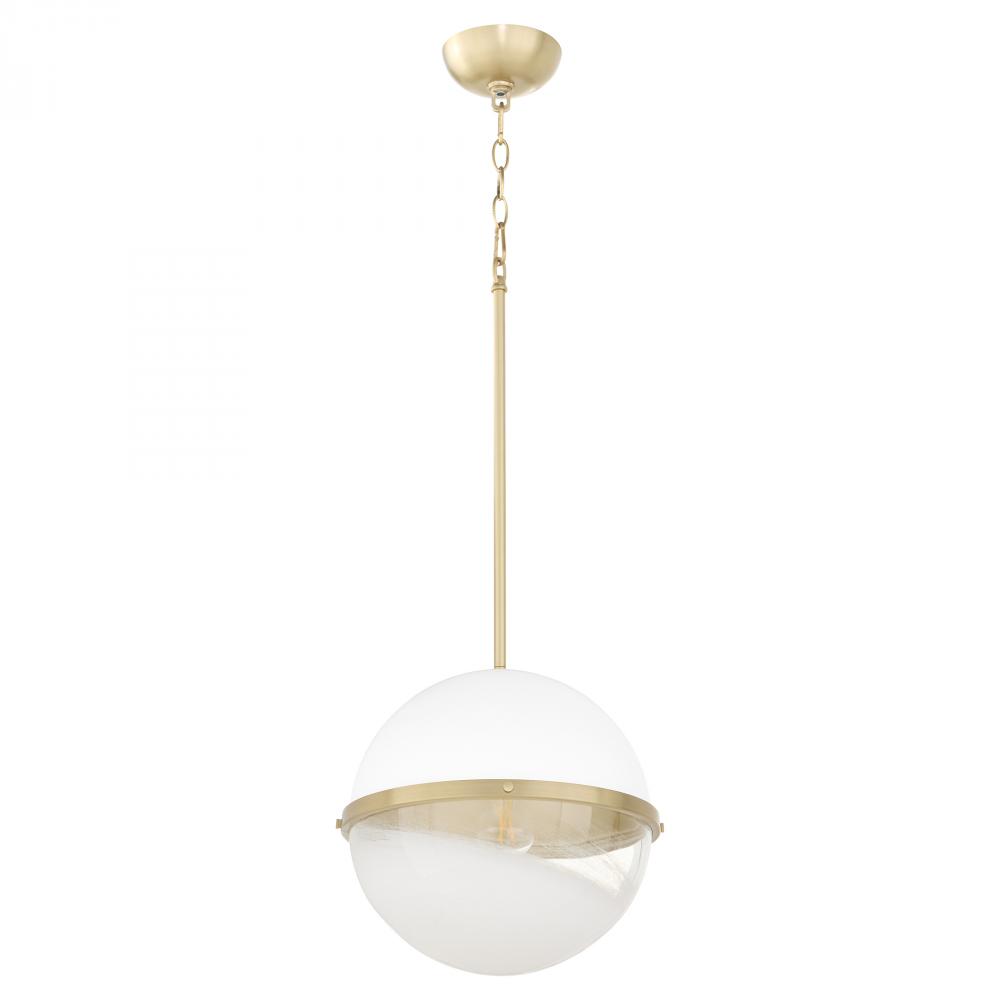 This eclectic one-light pendant is the perfect lighting solution for any modern industrial or nostalgic transitional space. A two-tone spherical shade with a studio white cap and milky glass base is divided by a vintage-inspired capture ring. Decorative screws pair with a matching aged brass chain and stem hanging system to complete the look.
