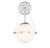 This Savoy House Polson 1-light wall sconce showcases a chic take on midcentury modern style inspiration. Its opal etched glass orb is held in place by a slender rod as well as a central band and metal strap around the arm. Finished in polished chrome. Polson is 15.5" in height, 8" in width and extends 8" from the wall. It uses one standard size bulb of up to 60 watts. Damp area rated.