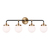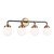 The Cafe four light vanity fixture in satin brass offers shadow-free lighting in your powder room, spa, or master bath room. Â Handsome two-tone finish and white glass globe shades.