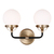 The Cafe two light vanity fixture in satin brass offers shadow-free lighting in your powder room, spa, or master bath room. Â Handsome two-tone finish and white glass globe shades.
