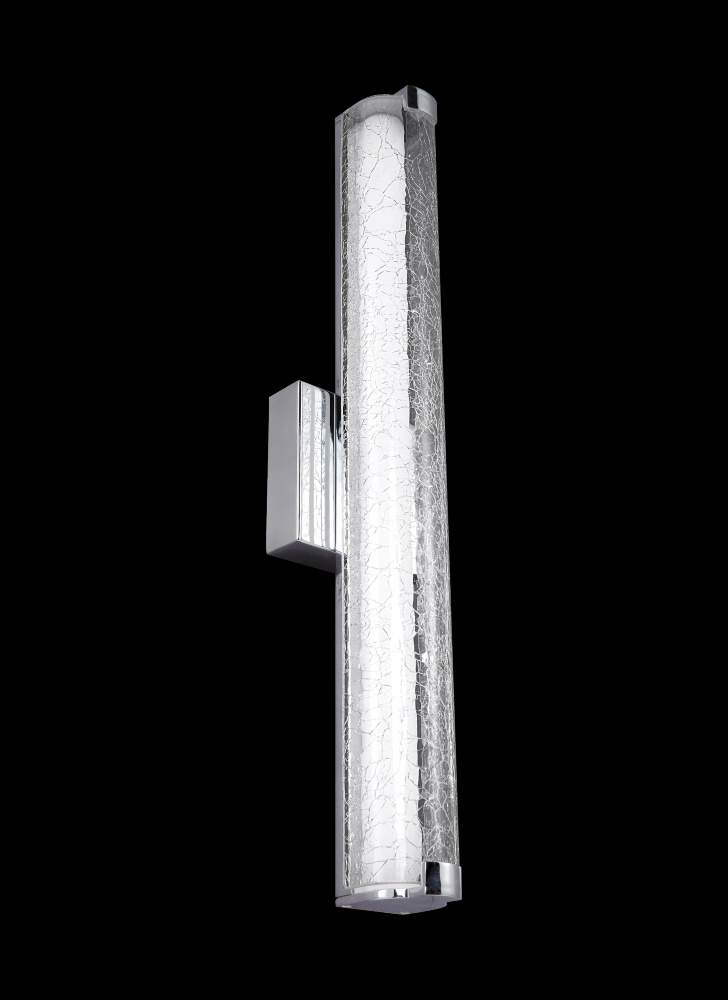 The Cutler one-light wall sconce in chrome offers shadow-free lighting in your powder room, spa, or main bathroom. The sleek linear profile of the Cutler Collection creates a perfect, contemporary backdrop for two unique glass options. Tiles of either Clear Crackle glass or Clear Staggered Rock glass are set in an organic version of a subway tile "look" and allow the LED light to shine through, adding rich sparkle to the room. Cutler is available in two finish options: Chrome and Satin Nickel.