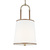 In the Katie one light shade pendant leather straps contrast with metal and white linen fabric shade to round out a timeless design. Available in: Time Worn Brass with Brown Leather or Polished Nickel with Black Leather. The combination of leather and steel gives this round chandelier equestrian flair.